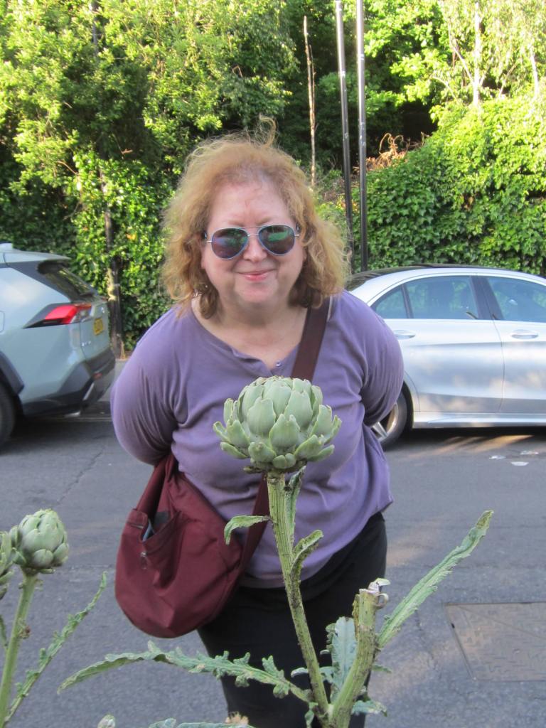 I leave Les at the bar while I check out a store that’s popped on my Insta – Wolfe and Badger. True to form, it is more interesting online than in person and has nothing that I need or want.  We take an alternative route back to the hotel and are charmed by potentially edible artichokes blooming by the road.  I’ve read that artichokes are members of the thistle family, but never expected to see them in a garden.  It’s fun to see them emerge from a bright purple stalk.