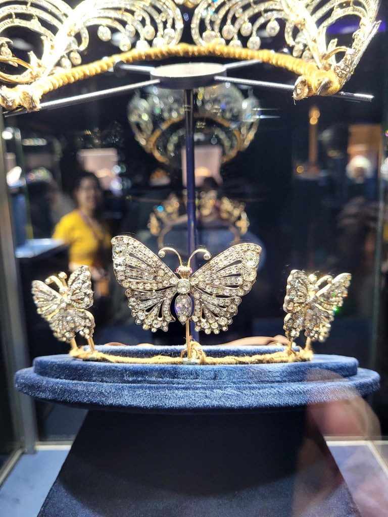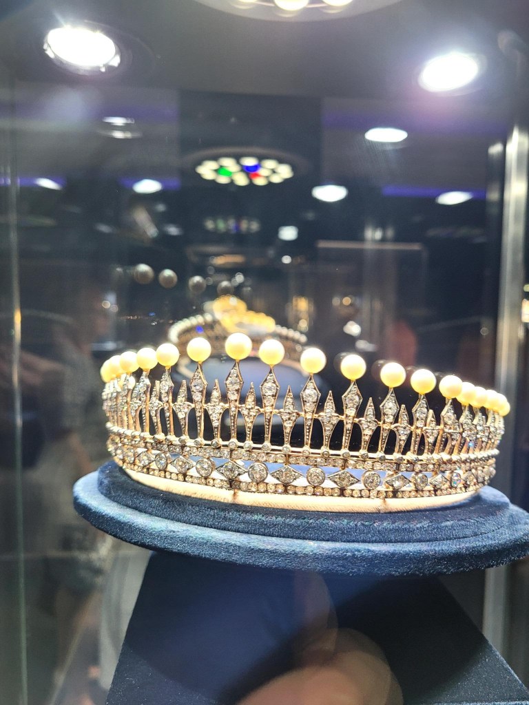 The Sotheby’s exhibit is fantastic.  The tiaras are delicate, floating in space, refracting light as they twirl slowly.  Diamonds, emeralds, pearls.  They are wonders of engineering, many convert to broaches, necklaces, bracelets.  I’m quite taken by a butterfly design and the ones with botanical inspirations.  Ivy and palm motifs are charming when rendered in diamonds and topaz.