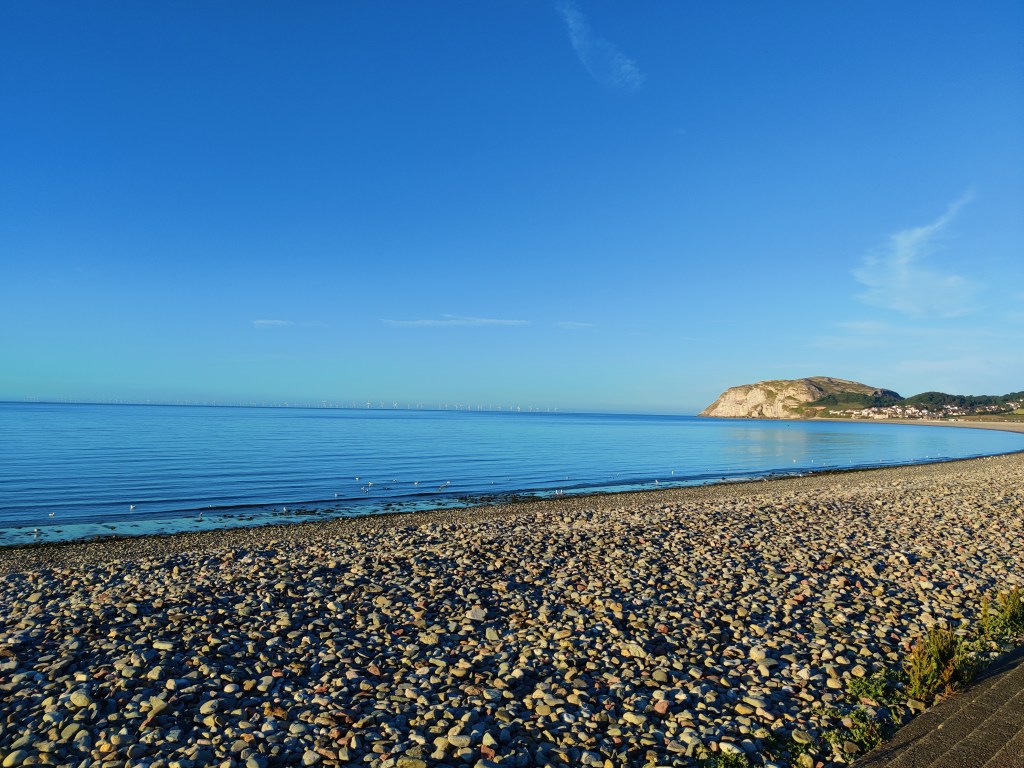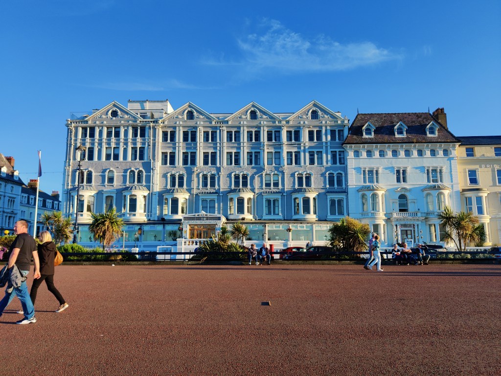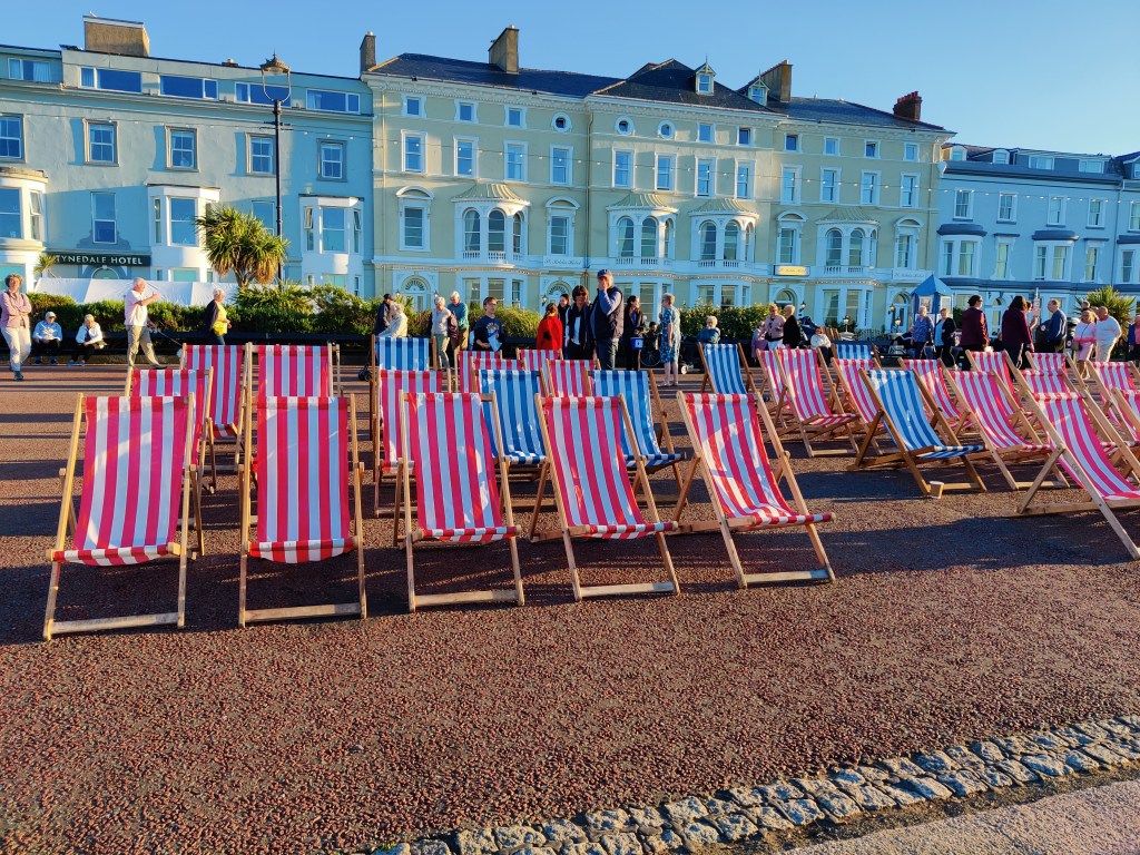Our hotel is on the water and it feels like a holiday beach town, with older and fancier buildings. After dinner, Les and I cross the street and enjoy the final moments of an outdoor concert. The sun is setting and the water sparkles – it’s beautiful and reminds me a bit of summer in Seattle. The evening lasts longer, the sun shimmers and bed is impossible. We trek along the bay and enjoy the fresh air and the snap of flags in the evening breeze. Wales is great!